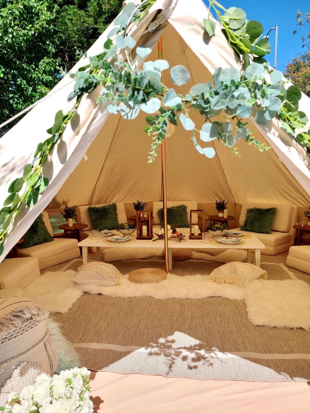 Enjoy a relaxed afternoon or evening with friends with our picnic table set-up. It is the perfect addition to our Bell Tent.